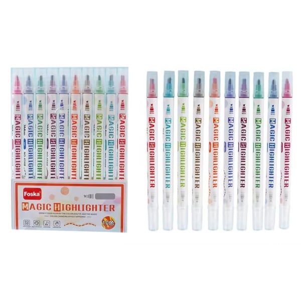 Pack of 10 Highlighter Pens with Luminous Magic Invisible Ink. This Pack of 10 Highlighter Pens with Luminous Magic Invisible Ink offers a fun and versatile way to emphasize text, create secret messages, and add visual flair to notes and projects. Each pen features bright colour‑highlighting on one side and magic invisible ink that becomes visible under light on the other, making it perfect for creative work, study notes, and playful activities. The smooth, intuitive design allows users to quickly mark key points, organize information, and enhance readability across documents, planners, and presentations. Filled with non‑toxic, child‑safe ink, these pens are suitable for school, home, and office use. The fast‑drying formula helps prevent smudging, ensuring clean and crisp results every time. A unique and engaging tool for students, professionals, and anyone who enjoys adding a touch of creativity to their work.